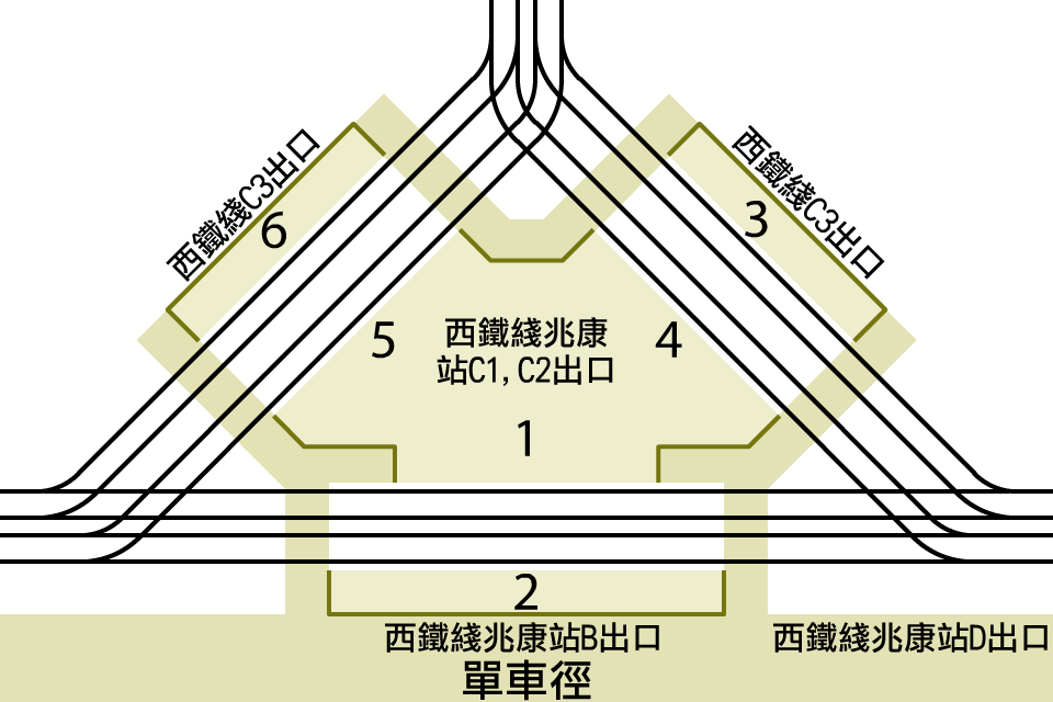 配合西鐵兆康站在此站上方及旁邊的興建及輕鐵兆康站的改建,2002年3月23日至2003年11月9日,所有列車晚上8時起改用位於此站以北約40公尺的2個臨時月台,部分日子甚至全日改用臨時月台。而2002年9月15日至2003年8月31日,當不需改用臨時月台(大部分日子的日間)時,505線改用6號月台,改在南行途經麒麟站。