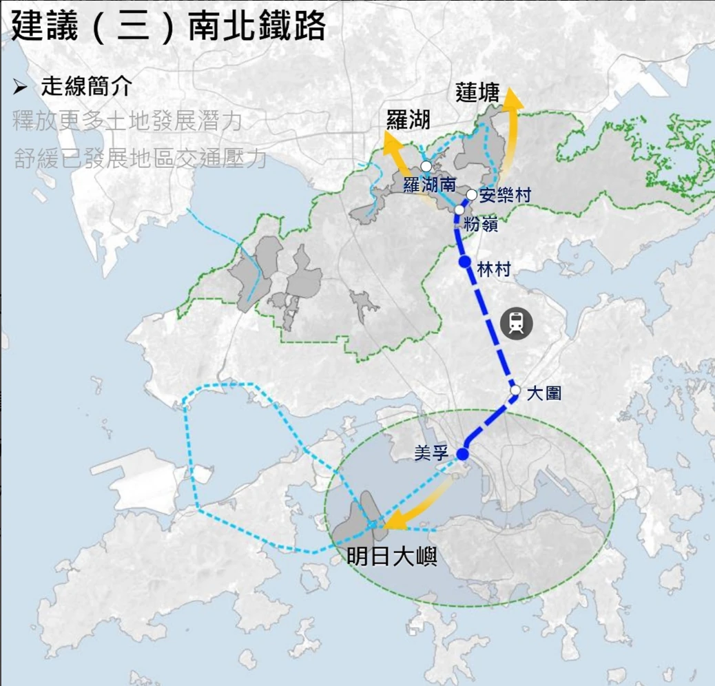 在北部都會區計劃下,政府擬將北環綫向東延伸,增建羅湖南、文錦渡、香園圍等車站,並以安樂村為總站,但該站未直接駁其他鐵路綫。團結香港基金研究總監及土地及房屋研究主管葉文祺建議,增建南北鐵路,聯繫北部都會區、明日大嶼及深圳都市核心區,提升區域連結性,並為未來人口與經濟增長提供基礎設施支援。