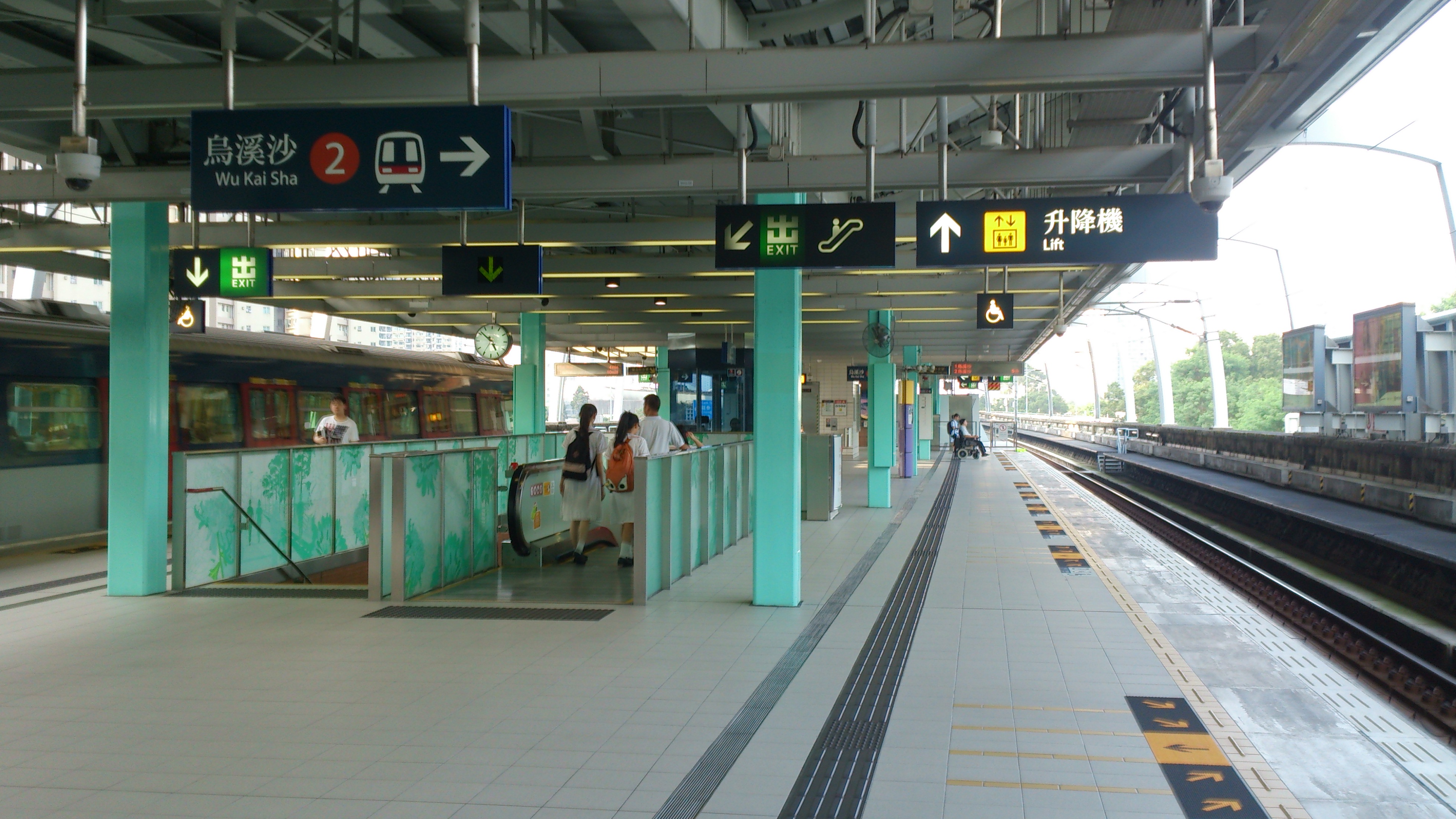 馬鞍山鐵路通車初期所使用的四卡列車;月台兩端設預留結構,以便日後增加列車卡數時延長月台。擴建部分經已落成啟用,馬鞍山綫亦已換入八卡列車行走,並加裝月台閘門,以配合此綫與西鐵綫及沙中綫新建路段合併為屯馬綫。