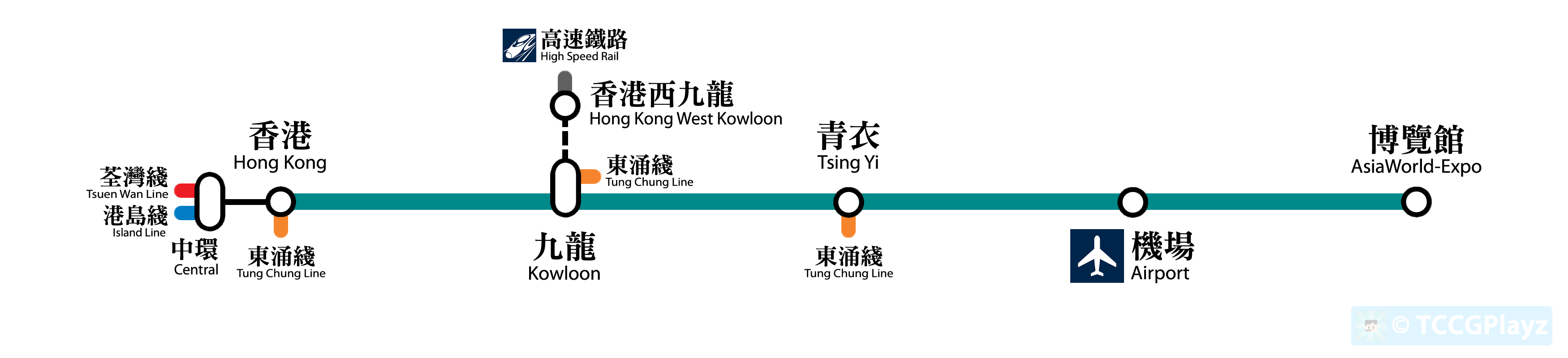 | 香港 Hong Kong | HOK | 1 | 東涌綫 荃灣綫、港島綫(中環站) | ||||