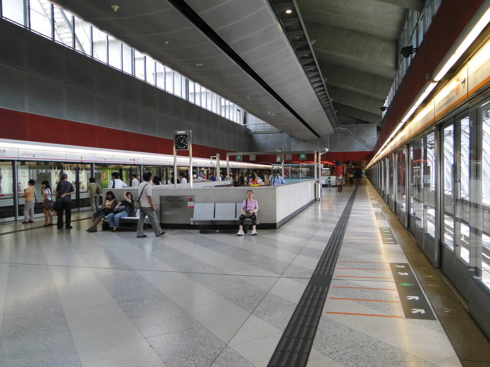 | 2號月台:荃灣綫中環方向(右邊車門)→ 行人通道(原荃灣綫荃灣方向月台軌道) 4號月台:東涌綫香港方向(左邊車門)→ |