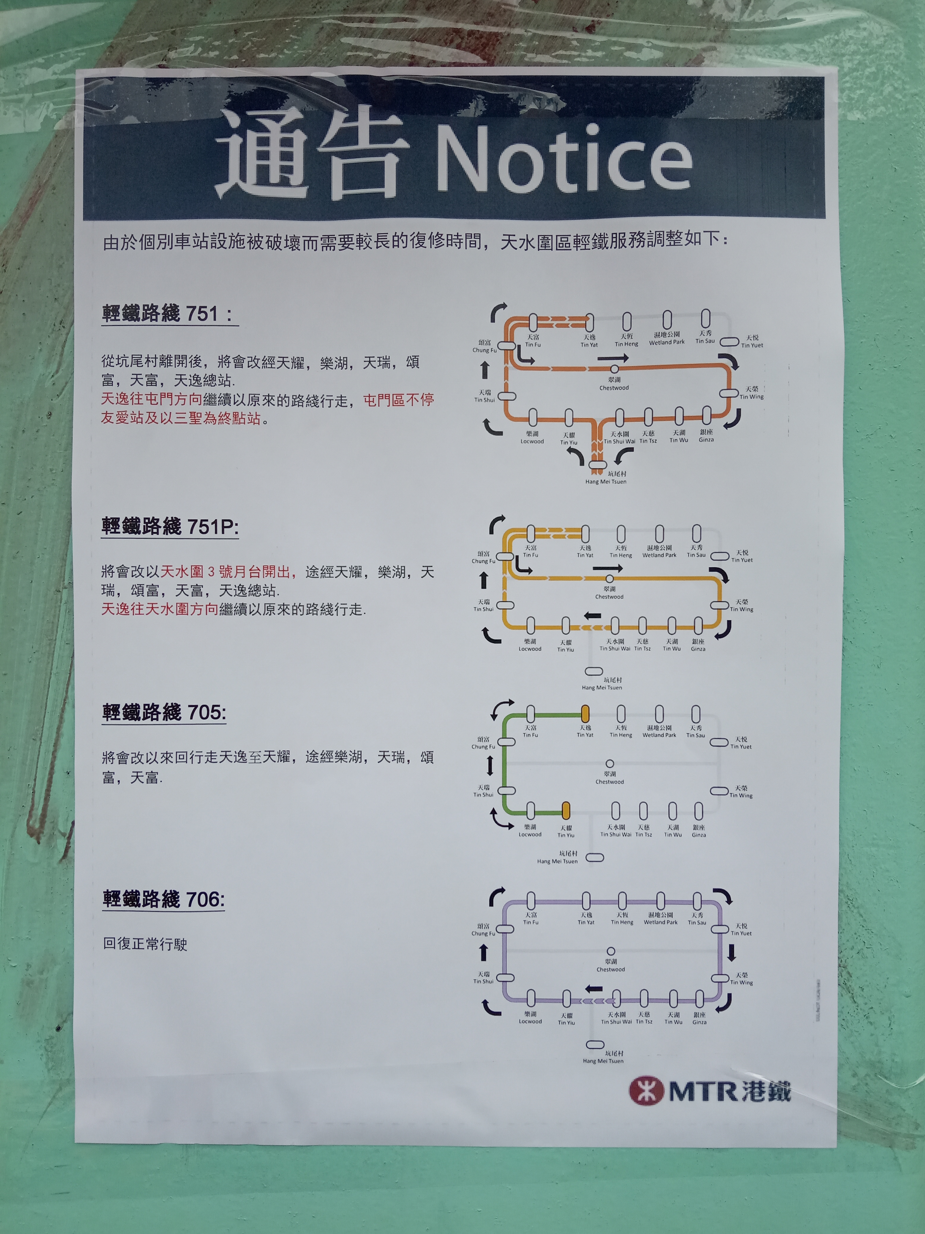- 2019年11月12日起:因部分車站及信號再次被破壞,751綫屯門區總站再次延長至三聖並不停友愛及翠湖,天逸方向到天水圍後以705綫方式,經天悅,濕地公園返回天逸,三聖方向行走原有路線到頌富後改經天瑞,天耀至坑尾村後返回原有路線,屯門區到市中心後不入友愛,並跟隨505綫前往三聖。